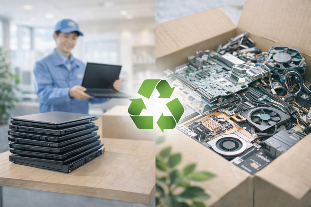 | リユース・リサイクル 回収したパソコンや各種機器は、状態や性能を確認したうえで、リユース(再利用)またはリサイクル(資源化)を行っております。再利用が可能な機器については、点検・整備を行い、中古パソコンやパーツとして有効活用いたします。また、再利用が難しい機器につきましては、提携している適正処理業者へ引き渡し、適切にリサイクルされます。環境負荷の低減と資源の有効活用を重視し、持続可能な社会の実現に貢献してまいります。 |