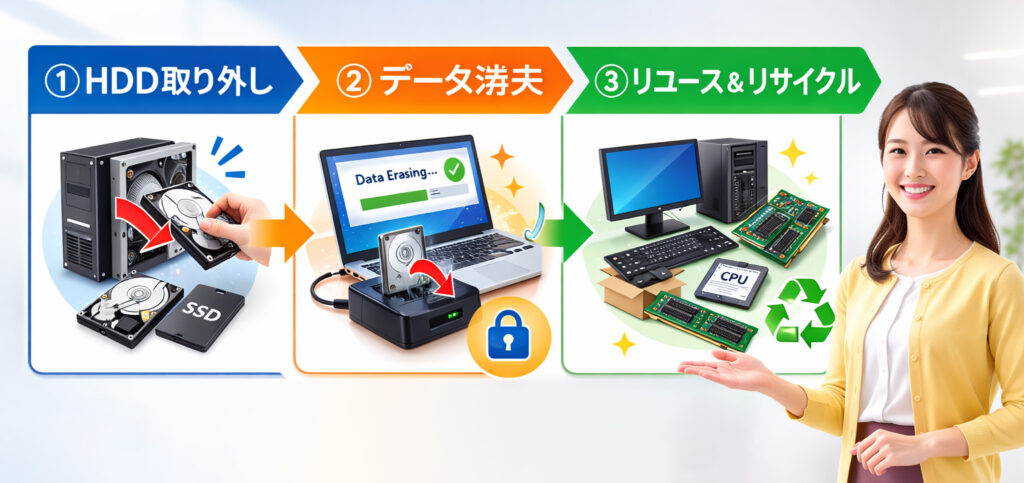 また、回収したパソコンを無駄にすることなく、リユース(再利用)・リサイクル(資源化)することで、循環型社会の実現に貢献しています。